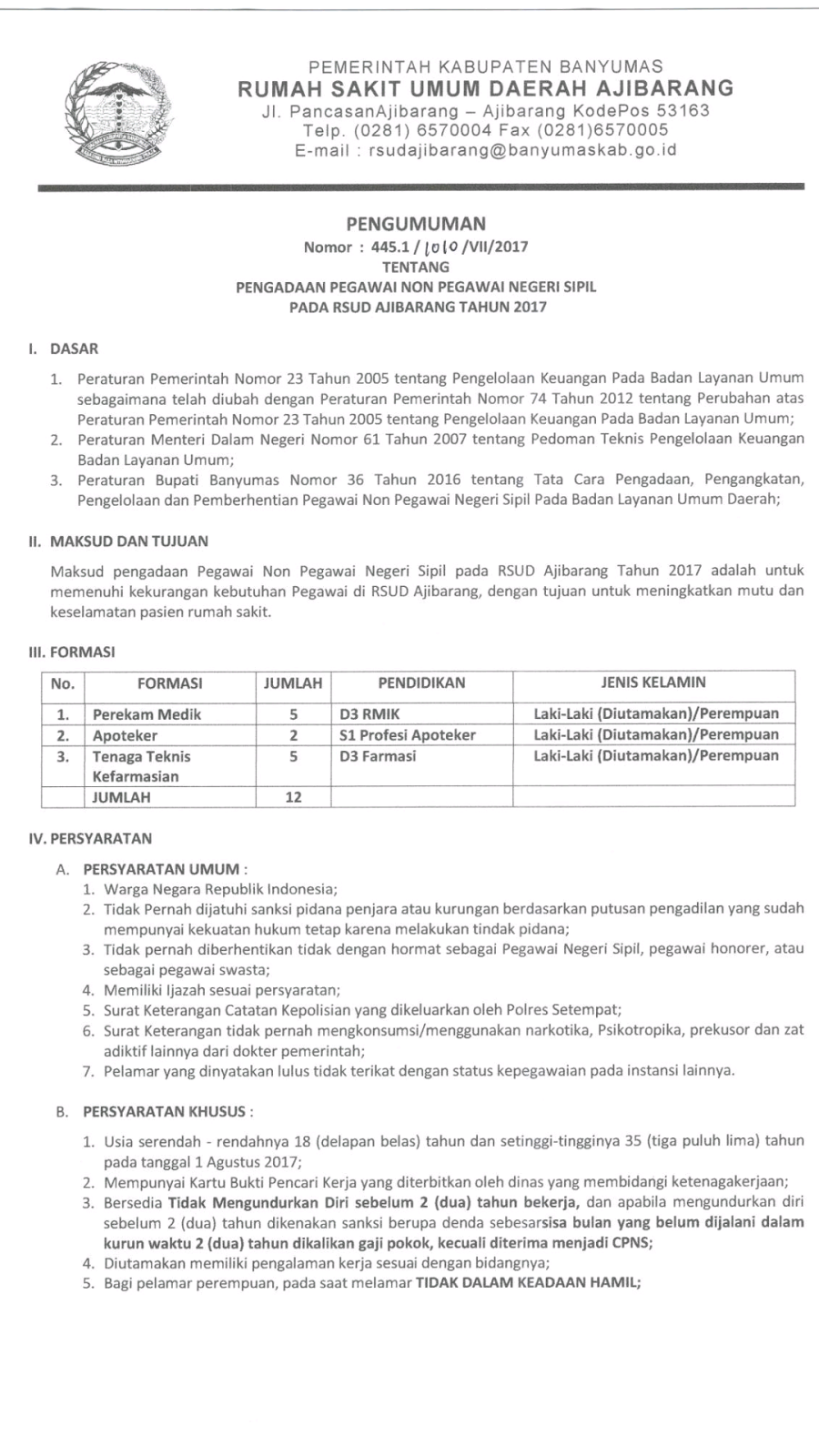 Pengumuman Pengadaan Pegawai Non PNS Pada RSUD Ajibarang Tahun 2017